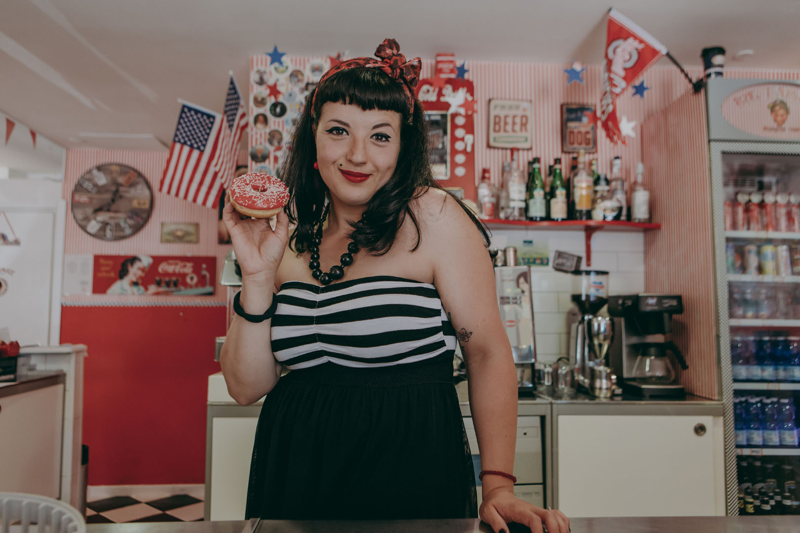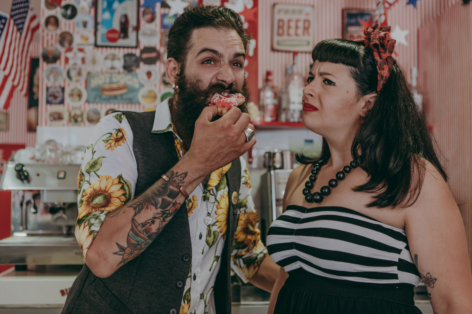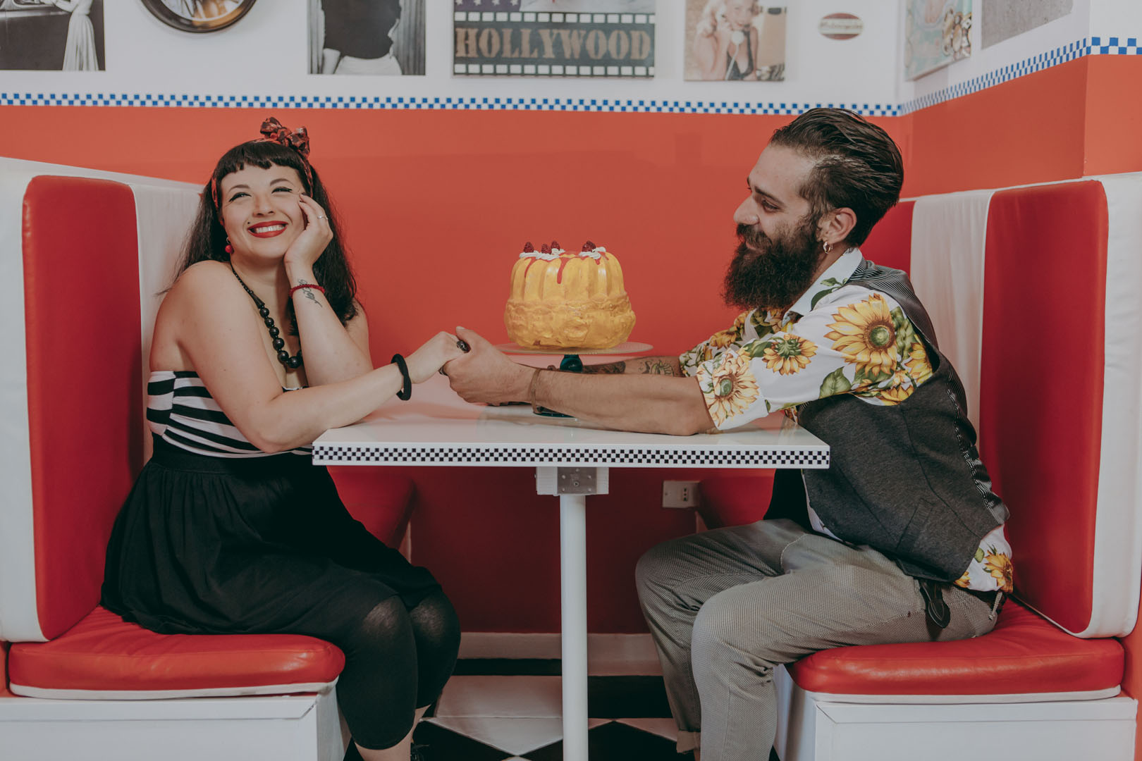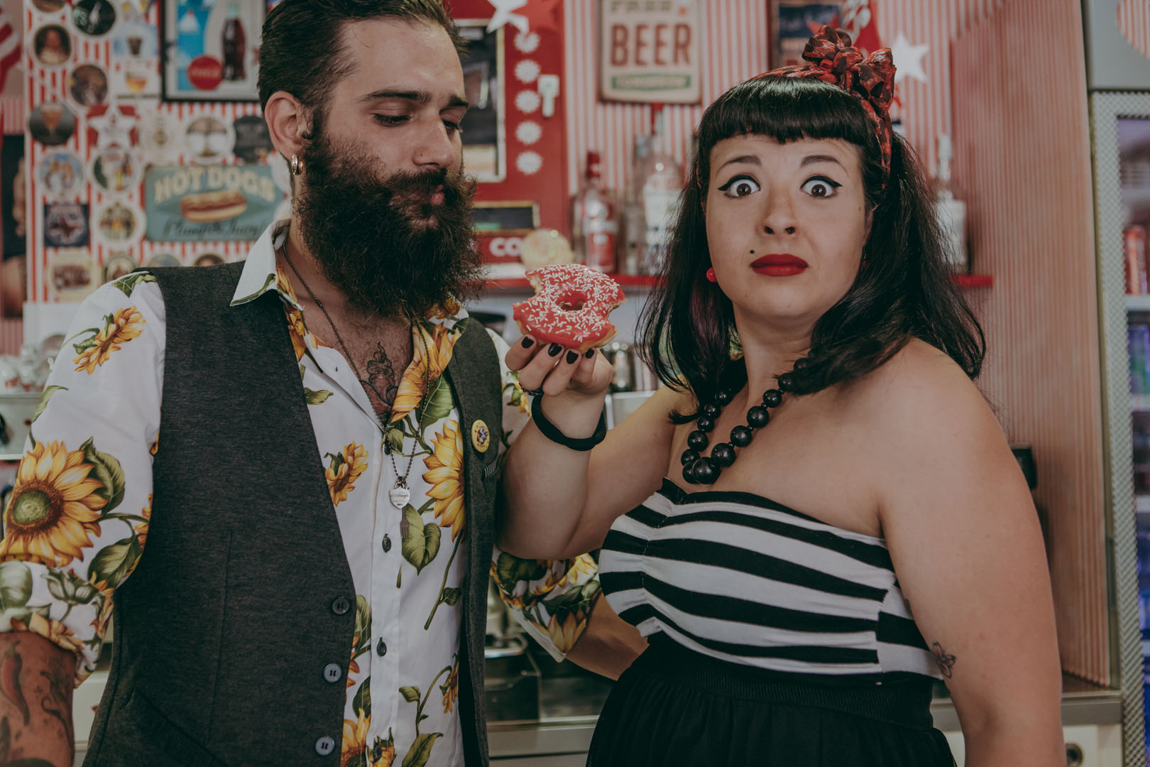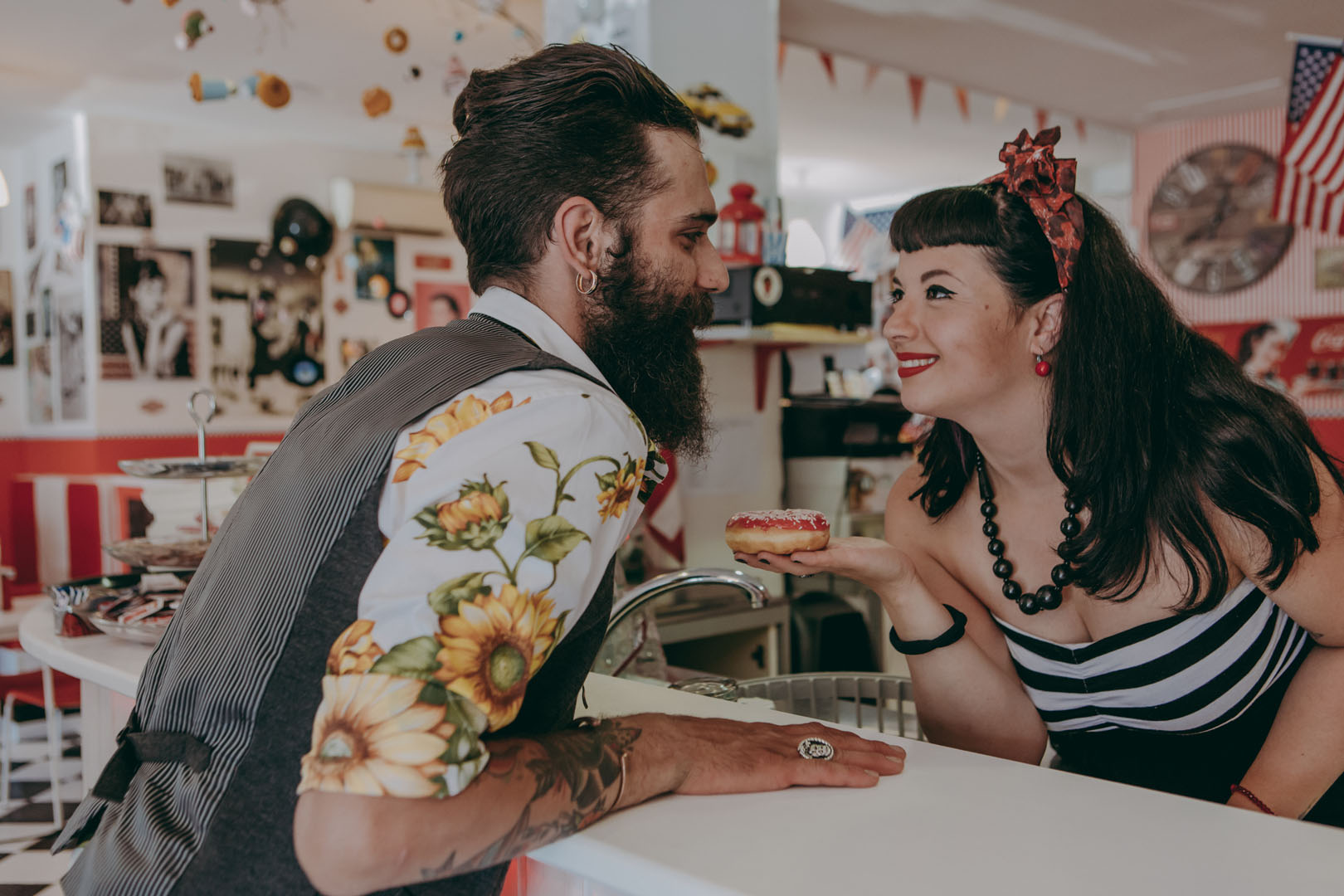 Non è possibile resistere ai “donuts” neanche durante uno shooting per un originale save the date in stile rockabilly realizzato in un American bar in stile anni 50, un ambiente non convenzionale ed esuberante in cui i due protagonisti, frizzanti, dinamici e imprevedibili come il Rock’n'roll hanno raccontato di un amore allegro e colorato e di uno stile di vita vintage ma attuale oggi come non mai!